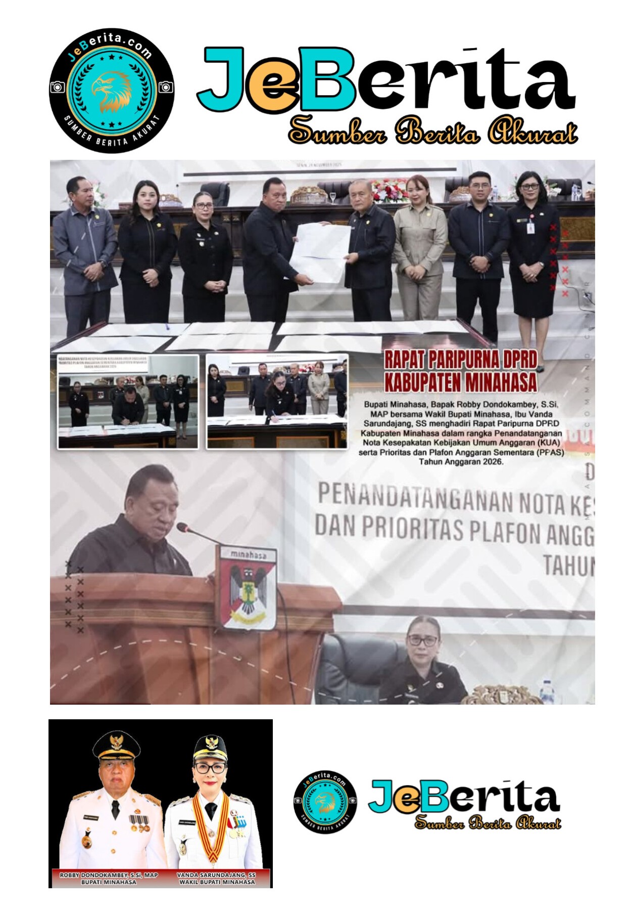 Pemerintah Kabupaten Minahasa dan DPRD secara resmi menandatangani Nota Kesepakatan Kebijakan Umum Anggaran (KUA) serta Prioritas dan Plafon Anggaran Sementara (PPAS) Tahun Anggaran 2026 dalam Rapat Paripurna yang digelar di Ruang Sidang DPRD Minahasa.